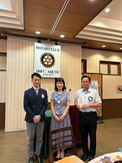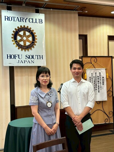 2025年07月10日(木) お知らせ 2025-2026年 初例会(2025/7/4) 7月4日、2025~2026年の初例会が開催されました。 原田前会長、吉本前幹事一年間ありがとうございました。 今年度の秋本会長、髙須幹事どうぞよろしくお願いします。 2025~2026年のクラブテーマは「Enjoy Rotary!」~繋がろう!広げよう!Rotaryの未来!~ です。 会長引継ぎ式の後、ベトナム出身で山口県立大学に通う米山奨学生のホアン ウイ チョイさんに奨学金が手渡されました。